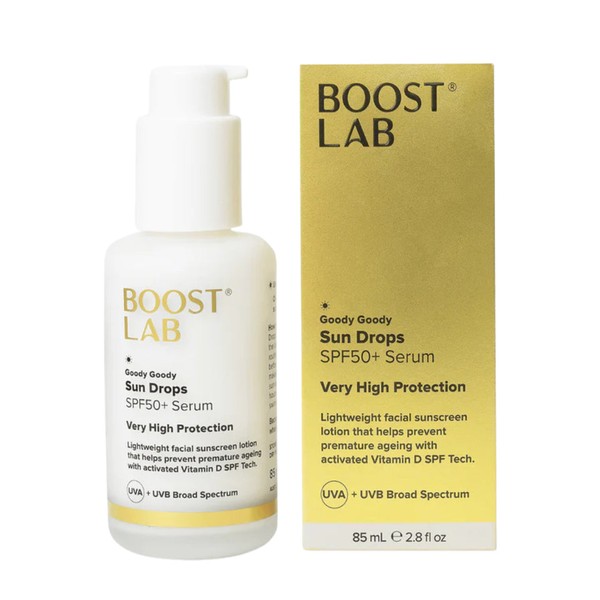 Boost Lab Goody Goody Sun Drops SPF50+ Serum is a lightweight, serum-texture sunscreen designed for everyday wear, now in a generous 85mL pump bottle. It delivers broad-spectrum SPF50+ UVA/UVB protection to help defend against sun damage and premature skin ageing, while sitting comfortably under makeup with a non-greasy, natural finish.