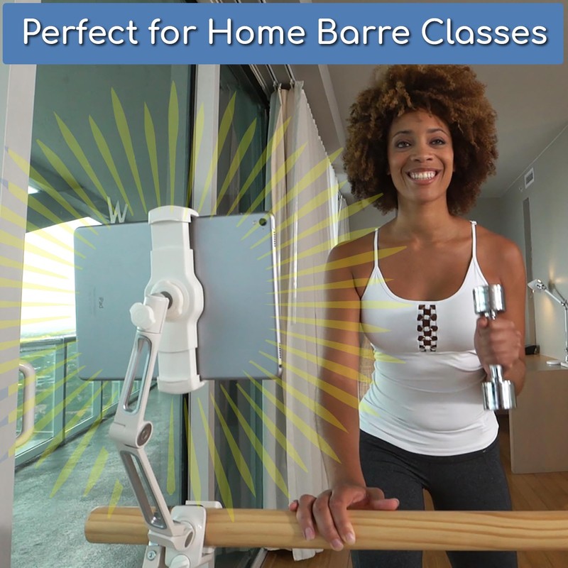 this specially designed Tablet/Phone holder. It clamps on the wooden barre,