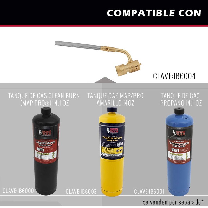- Se puede utilizar con Tanques o cilindros de Gas Propano (azul), MAP/PRO (propileno - amarillo) y Clean burn (propileno - negro)