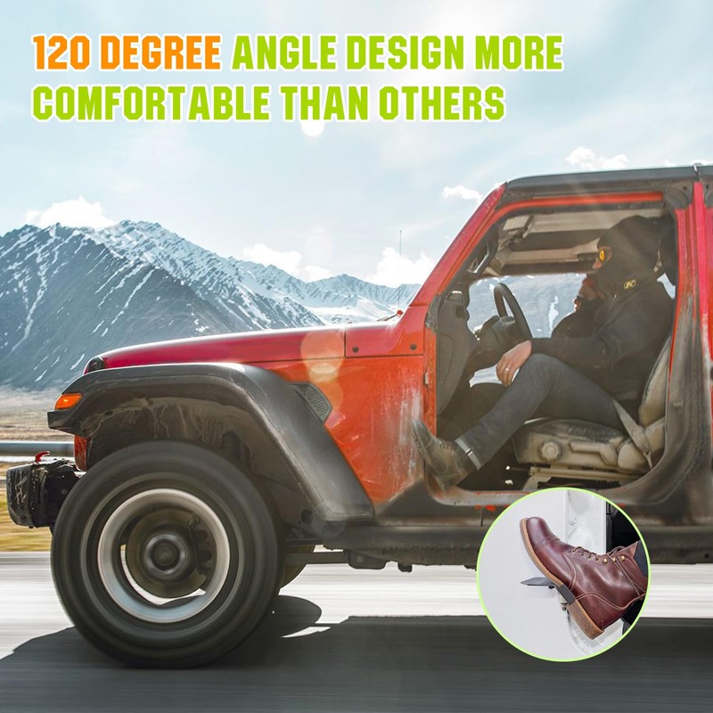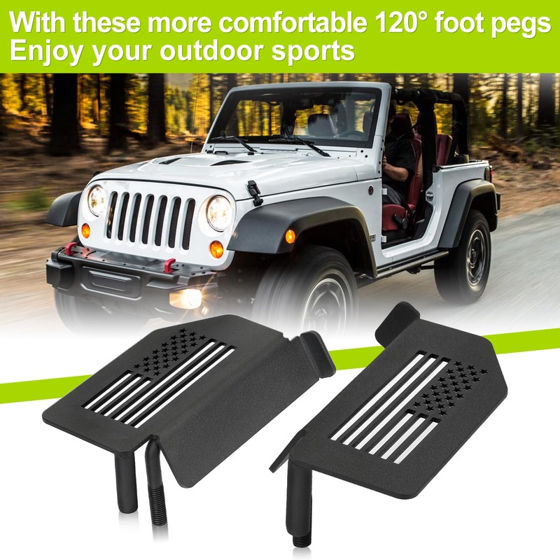 - Design: Anti-skid surface keeps your feet from slipping off pegs, especially in muddy and wet conditions. Iconic "Flag" pattern makes your car look cool.120 degree angle design makes you more comfortable. No extra drilling required or modifications for installation.