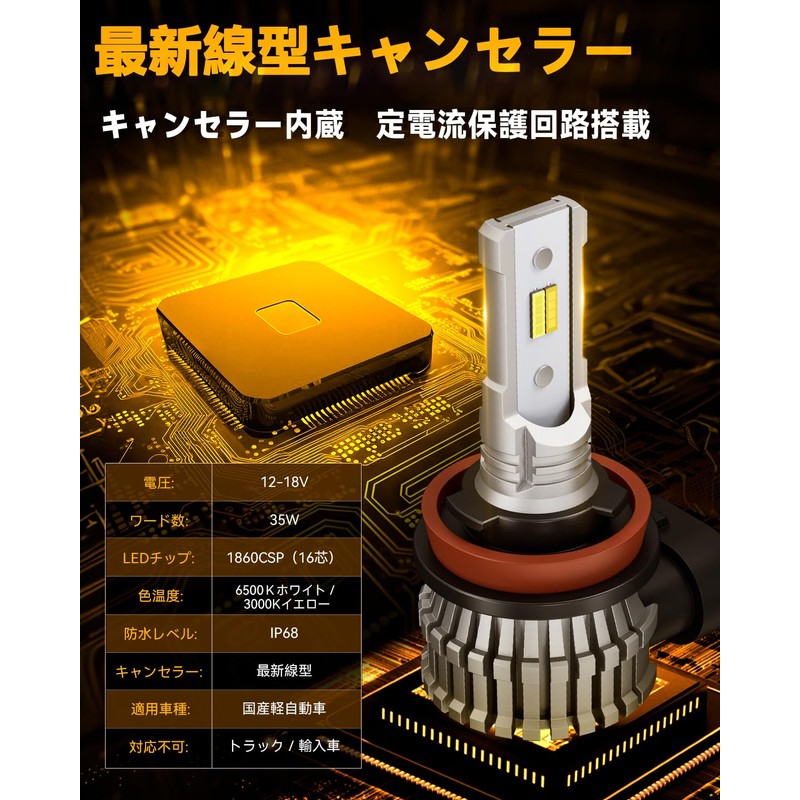 - Equipped with the latest LED chip & 2 colors h8 LED fog: Do you want to use it as a lighting aid, but you are concerned about light imperfections? Have you ever wondered about choosing the color when buying a single color fog? Our h11 led fog light two colors adopt the latest technology, using high quality and explosive CSP1860 chip to provide even and no gaps. With 35 watts of power, it solves problems such as poor light off, dark areas. You can also change the color with a single touch using the fog light switch, and you can change the color according to the weather and road conditions to support your driving comfort. Switch to yellow (3000k) on bad weather days for a more powerful light transmission Even in the rain or fog, you can drive with confidence. White (6500k) is ideal for sunny days and normal driving and brightens up the road with headlights. You can always have a clear view and clearly understand the intersection and curves, giving you the right driving experience
