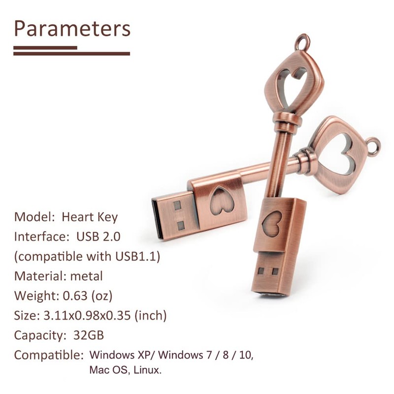 • ✅ 32GB usb flash drive x1, with a gift box. Retro metal heart key shaped memory stick. It also makes a great wedding or anniversary gift.