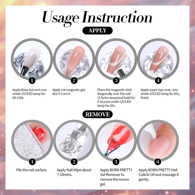 - Easy application and good tenacity: the cat magnetic eye gel nail polish is long lasting for 21+ days with perfect shine under proper application. Premium formula not easy to peel off - with base gel top coat under the full application process. High durability and intense pigmentation makes it stay last longer and brings you brilliant shine finish