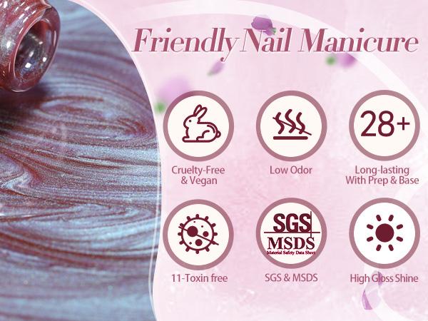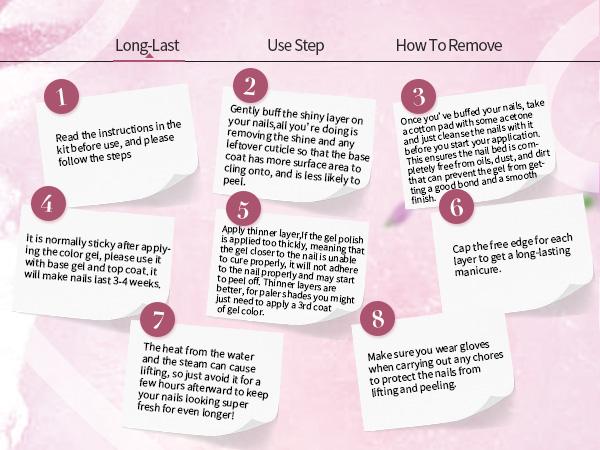 - HEALTHY GEL POLISH :Healthy ingredient with low odor! No harsh ingredients or adhesives that lead to damaged nails. Only used for nail and non-direct contact with mouth,eyes. Wash immediately if contact occurs. Keep the products away from the pregnant and the kids.