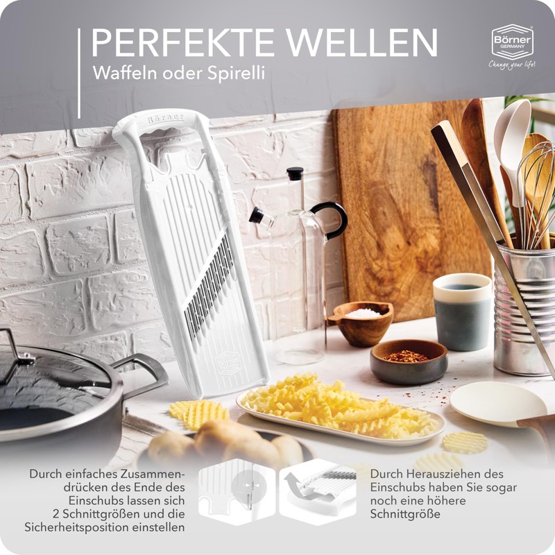 - PRAKTISCHER WAFFEL- & WELLENSCHNEIDER – Mit dem original Börner PowerLine Waffel- & Wellenschneider können Sie Wellen und Waffeln in drei verschiedenen Stärken aus festem Obst & Gemüse schneiden. Die kreative Optik bringt Abwechslung auf den Teller. Der Gemüseschneider schneidet blitzschnell Wellen oder Waffeln.