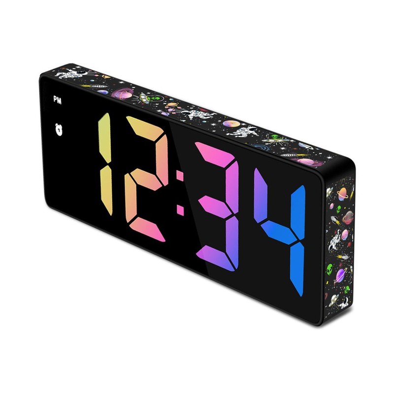 Bornore Digital Alarm Clock LED Rainbow for Bedroom with Mirror Surface Weekday/Weekend Mode Small Clock Temperature Display Adjustable Brightness Voice Control Table Clock for Kids(Astro)