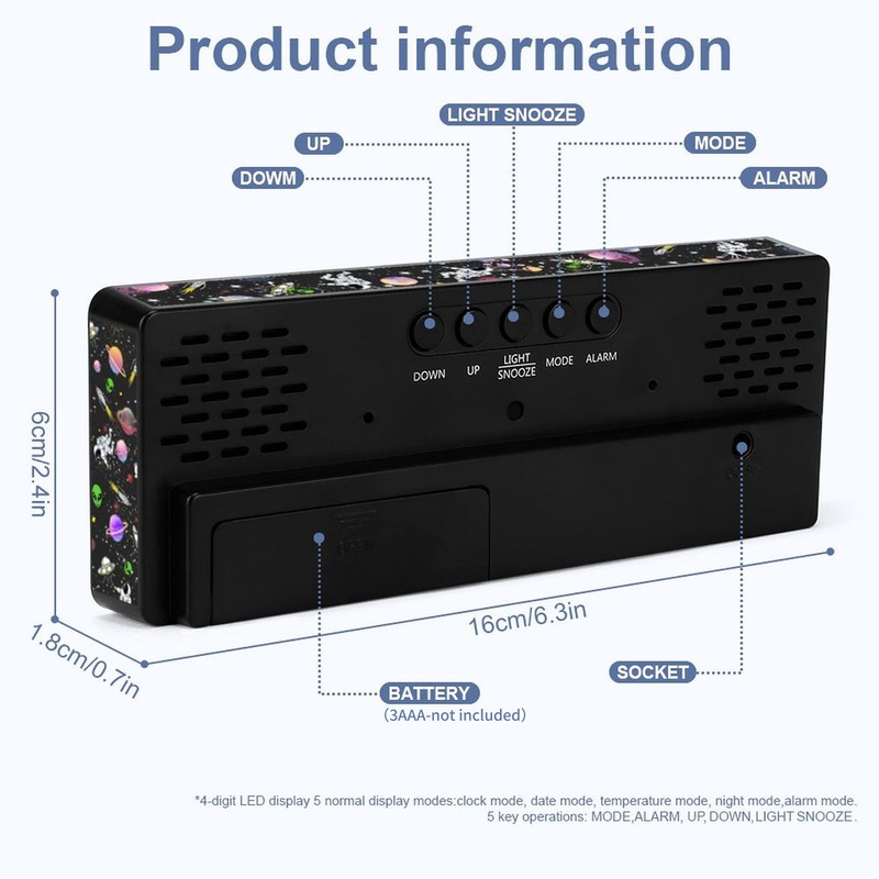4-digital LED display modes:Clock mode;Date mode;Temperature mode;Night mode;Alarm mode