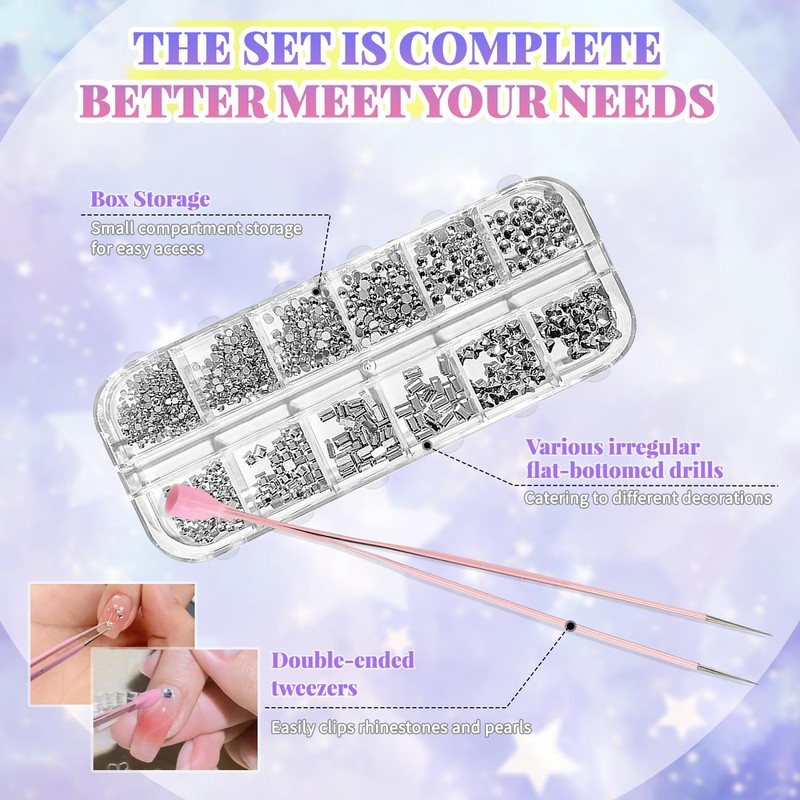 - Comprehensive Set: Everything you need in one box 12 compartments of rhinestones and a double-ended tweezer, providing endless possibilities for nail art and beyond.