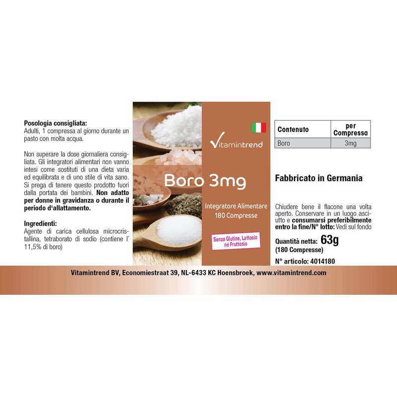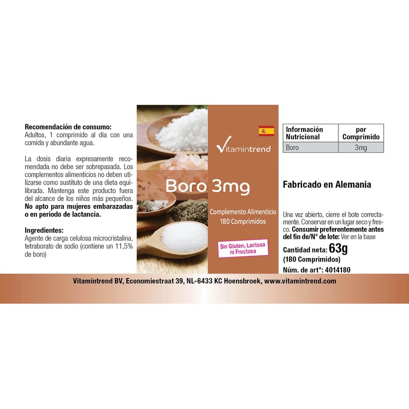 - Vitamintrend made in Germany. One tablet contains: Boron 3 mg - recommended daily dose: 1 tablet with lots of water - highly dosed active ingredient - excellent value for money. 3 mg boron per tablet.