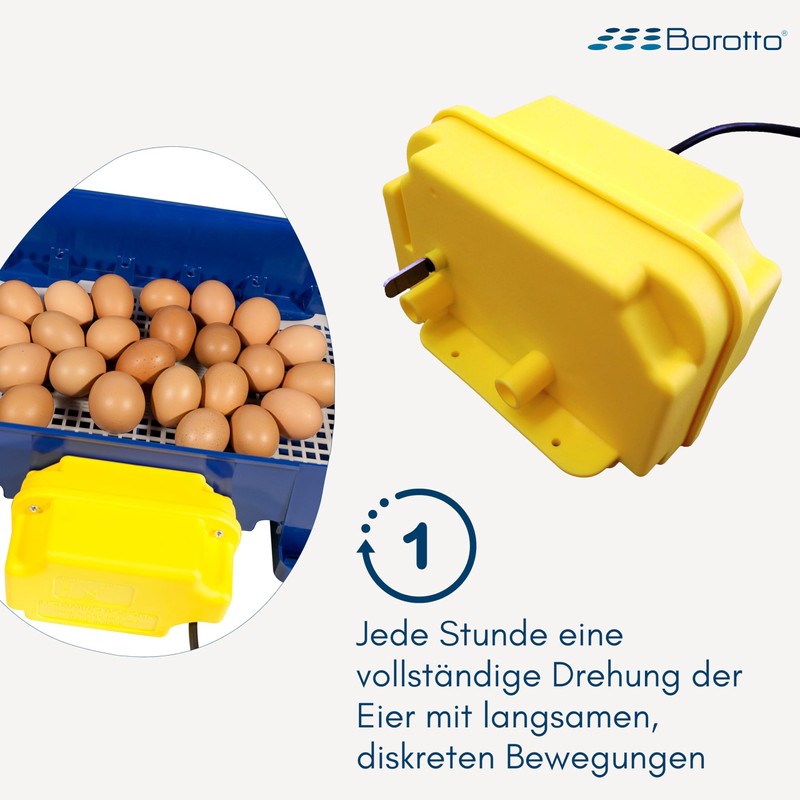 - Efficient & reliable - The Borotto Real series automatic egg turner for incubators is configured to perform a full turn per hour (full tilts from right to left or vice versa), just like it happens in industrial incubators.