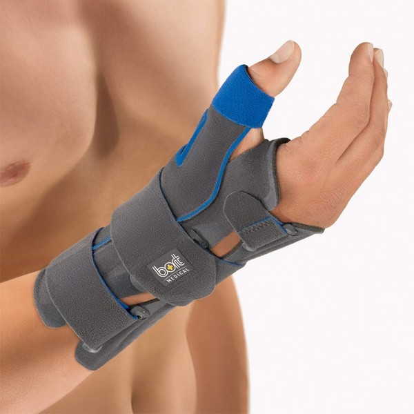 The Bort SellaTex wrist brace with additional immobilisation of the thumb base and thumb saddle joint can be used in the treatment of injuries and overloads of the wrist and metacarpal for immobilisation.