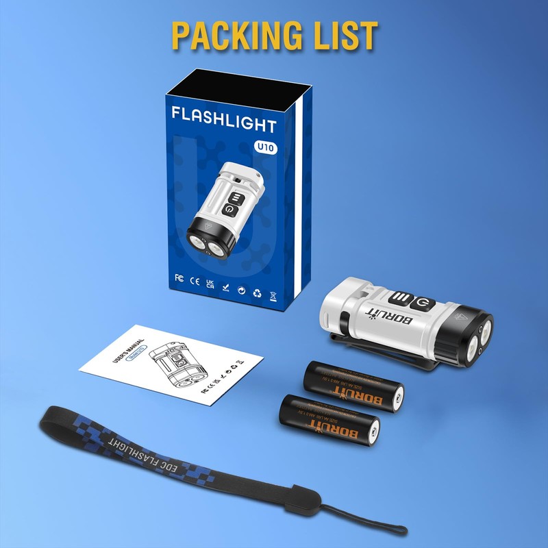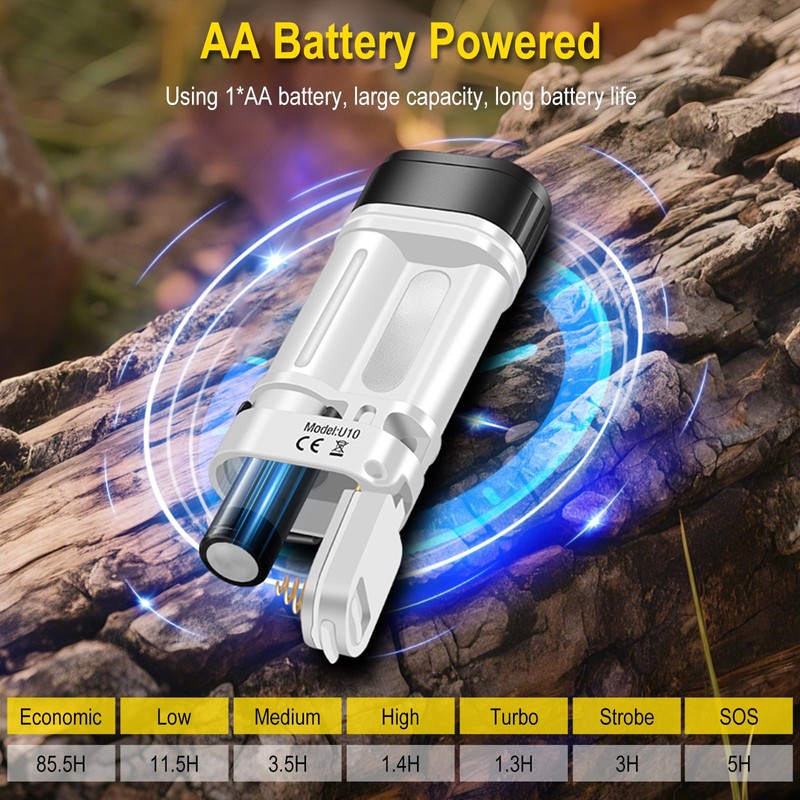 • Convenient EDC Flash Light:Includes pocket clip, lanyard, and a strong tail magnet for hands-free use. IPX4 waterproof. Whether you're camping, hiking, or working in dim conditions, the U10 flashlight delivers reliable light.