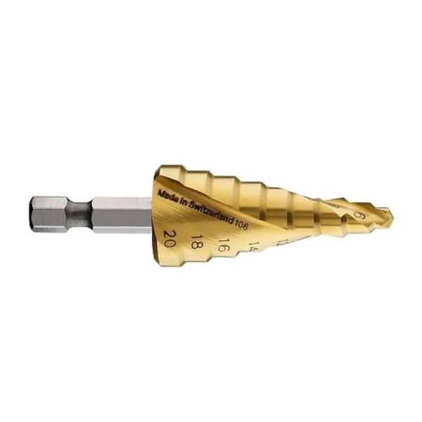 - Step Drill Bit HSS-TiN 1/4" hex 4 / 6 / 8 / 10 / 12 / 14 / 16 / 18 / 20