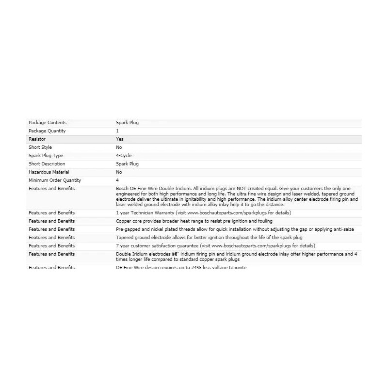 Bosch Double Iridium Spark Plugs are engineered to deliver both high performance and long life, representing advanced OE spark plug technology. The ultra-fine wire design and laser welded tapered ground electrode deliver optimum performance, while the iridium center electrode and ground electrode help it to go the distance. Unlock the performance in your engine with Bosch Double Iridium Spark Plugs.