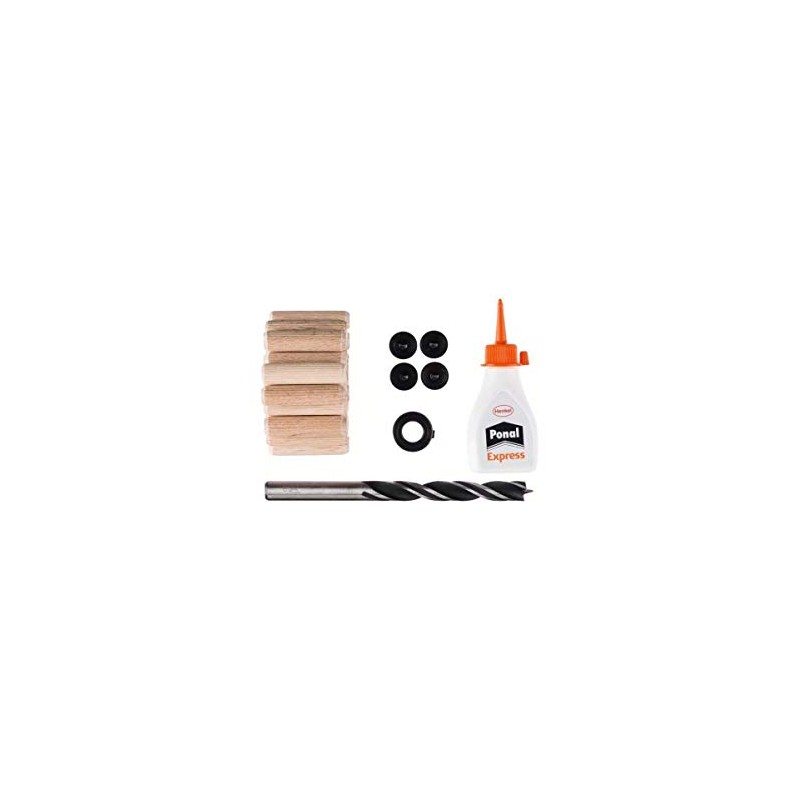 - Complete set with wood drill, depth stop, dowel set, ribbed wooden round dowels and wood glue