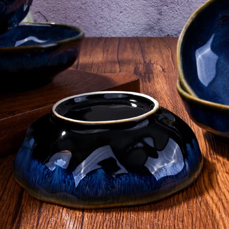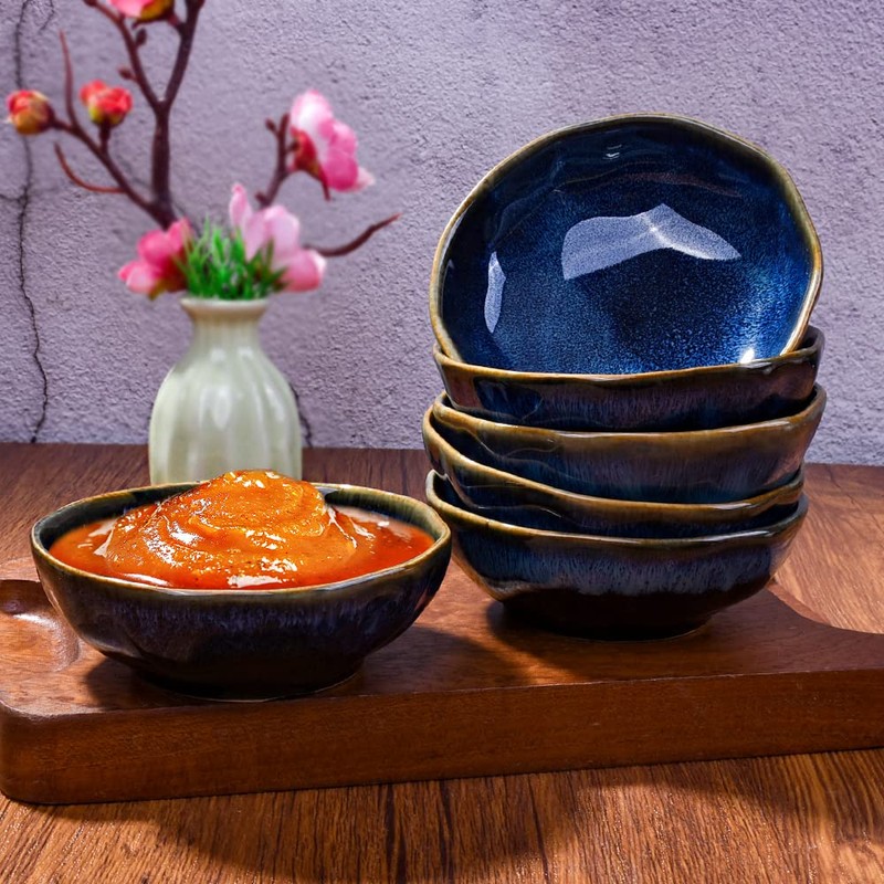 BOSILI Ceramic Soy Sauce Dishes Set of 6 Dipping Bowls for Sushi Snack Condiments (Blue Kiln)