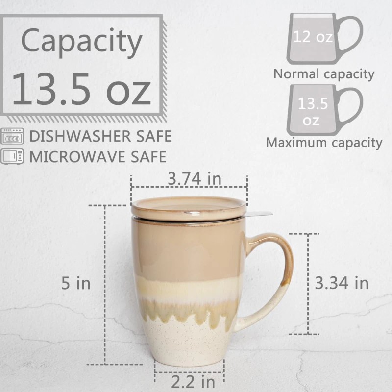 This tea cup has an appropriate capacity(13.5 oz), which will definitely meet your needs for office and home.