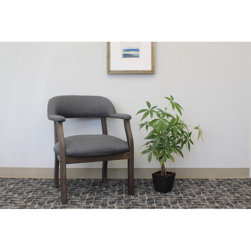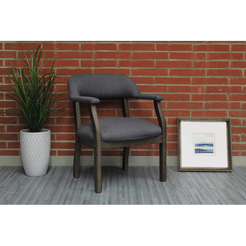Captain's chair upholstered in slate grey commercial grade linen fabric. Sturdy driftwood finish frame. No-sag spring seat.