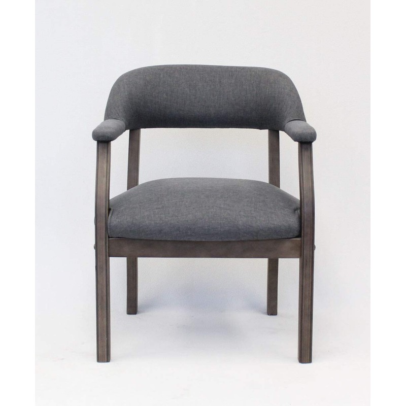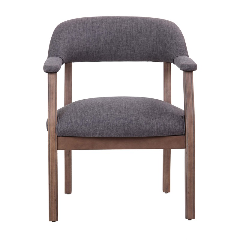 Captain's chair upholstered in slate grey commercial grade linen fabric. Sturdy driftwood finish frame. No-sag spring seat.