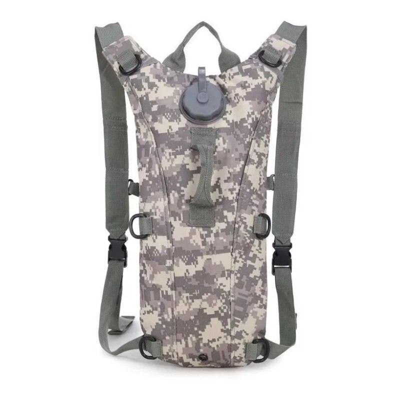Su diseño táctico militar le da un toque único. Cuenta con dos tirantes ajustables para que la transportes como mochila y un broche frontal para una mayor fijación. Compartimiento interior para objetos personales, ganchos delanteros para colgar los engranajes al aire libre, manguera de hidratación larga, válvula de encendido / apagado, boquilla fácil de limpiar.