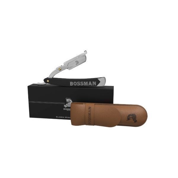 Bossman Classic Straight Razor is designed to shave any part of the head, face, and body, and is great for perfecting cheek lines or under the neck for our bearded fellas! This professional barber quality razor features a double-sided blade replacement mechanism and a 100% stainless steel blade holding head that is guaranteed to never rust or tarnish. The razor also has Bossman's rooster logo for a cool and modern look, a sliding clip mechanism for an easy replacement process that holds the blade securely, and a smooth finished natural black wood handle with Bossman logo that fits perfectly into your palm. The razor has an easy fold action to store away and comes with a leather protective case with Bossman logos included. It is shipped in a stylish magnetic box with foil art finishes, but double-sided blades are NOT included. What are the benefits and features of Bossman Classic Straight Razor? Designed to shave any part of the head, face, and body. Great for perfecting cheek lines or under the neck for bearded individuals. Professional barber quality razor with double-sided blade replacement mechanism. 100% stainless steel blade holding head guaranteed to never rust or tarnish. Bossman's rooster logo for a cool and modern look. Sliding clip mechanism for an easy replacement process that holds the blade securely. Smooth finished natural black wood handle with Bossman logo that fits perfectly into your palm. Easy fold action to store away. Leather protective case with Bossman logos included. Shipped in a stylish magnetic box with foil art finishes. Double-sided blades are NOT included. Who is Bossman Classic Straight Razor for? This razor is perfect for men who want a professional-quality razor that is versatile enough to shave any part of the head, face, and body, and is great for perfecting cheek lines or under the neck for bearded individuals.