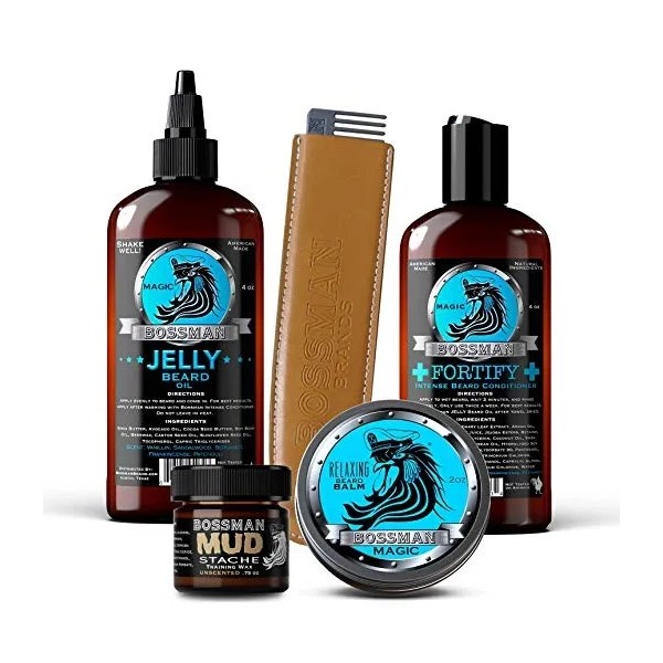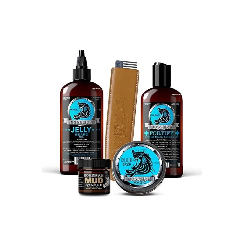 SU TRATAMIENTO COMPLETO BARBA PAQUETE - Incluye la intensa crema Barba Barba Acondicionador fortalecer la jalea de petróleo del relajante Barba Bálsamo y Metal barba bigote peine Hace un gran regalo fijado para hombres con barba 4 selecciones perfumadas .; FORTALECER LA BARBA DE AIRE INTENSO - Para la ducha 2x por semana para reponer los poros secos y el vello facial Ayuda a estimular el crecimiento de la barba con toda Lavarse la cara humectante natural y la barba con champú y luego aplicar la loción de aire directamente a la barba y el bigote para obtener mejores resultados .; ACEITE JELLY BEARD - para hidratar los poros y suavizar el cabello facial La Barba aceite Jelly es superior a los aceites barba convencionales debido a su aumento de la viscosidad y la capacidad del gel para formar una mejor unión con los poros folículos del pelo y la piel Detiene sequedad barba picor y fragilidad .; Se relajen BARBA - Una cera similar a la mantequilla que atrapa la humedad y las vitaminas esenciales y minerales en el vello facial para su nutrición a largo plazo ayuda a que su barba y bigote crecer más rápido y se vea más grueso, una parte esencial de su kit de aseo personal .; AROMA MAGIC - mezcla caliente y embriagador de la rica madera de sándalo y vainilla aceites que crea una base limpia pretende destacar los acentos de bergamota, pachulí y incienso. Era el original Bossman olor por una razón. Este olor es perfecto para encuentros cercanos, ocasiones especiales y los días en que su barba tiene que ser lo más suave que eres. Todos nuestros productos estan en inglés SKU 4061907166