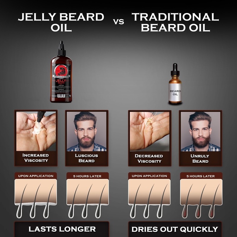 Carefully chosen natural oils moisturize the facial hair follicles and pores to stimulate beard growth and thickness for a refined, polished, and seductive look. The increased viscosity of the Jelly™ penetrates deep into the beard and hydrates the roots of the hair follicles for a luscious and flowing beard. With double the quantity of most other beard oils, this product lasts twice as long and is best used with the scented balm or conditioner kit.
