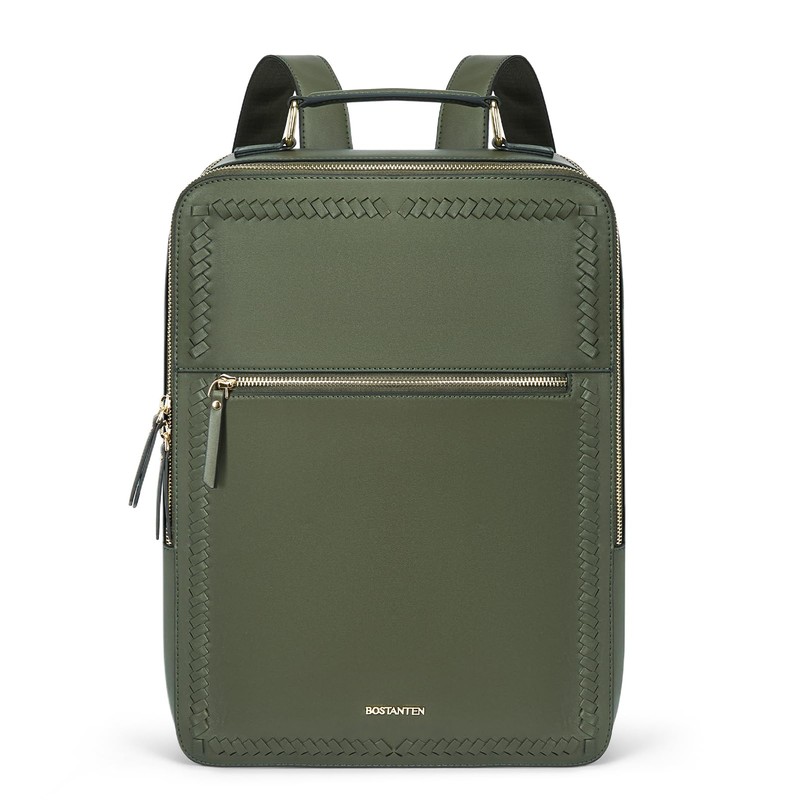 BOSTANTEN Leather Backpack 15.6 inch Laptop Bag Travel Casual Computer Backpack College Business Work Shoulder Bags with Trolley Sleeve for Women Men Olive Green