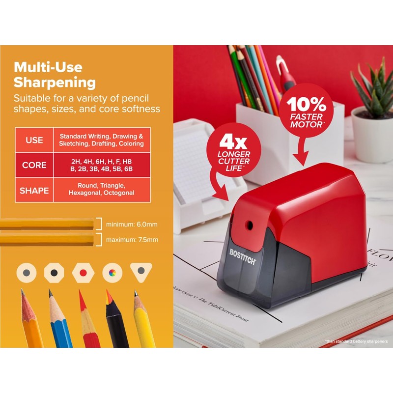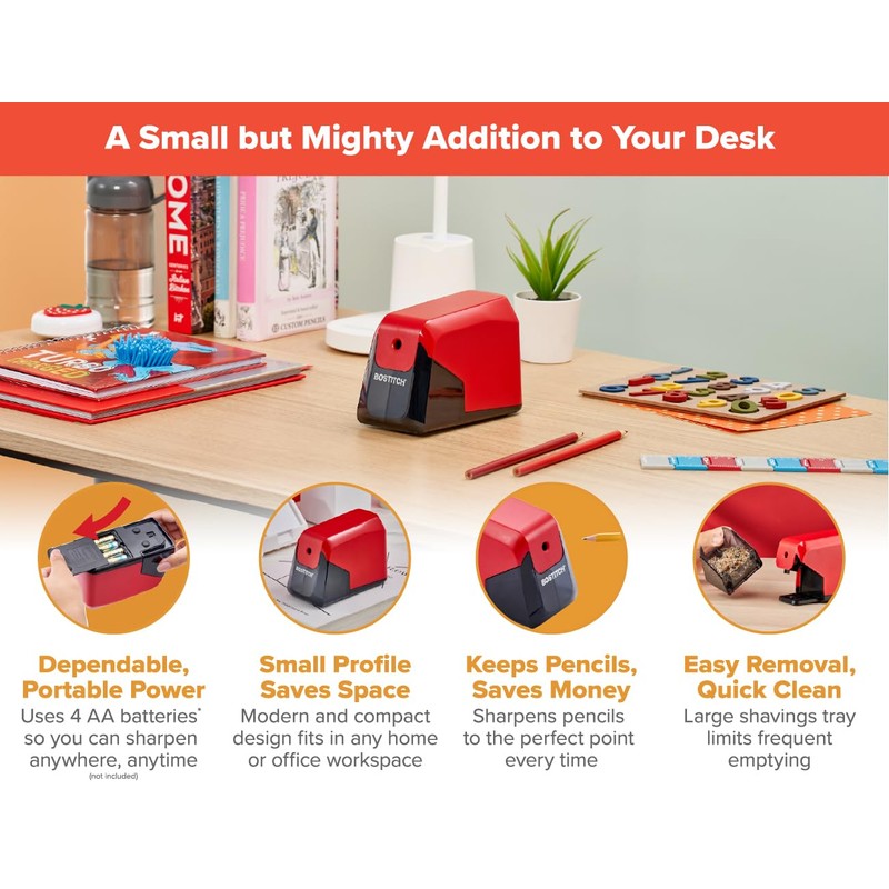 Bostitch Office Battery Pencil Sharpener, 4X Longer Cutter Life, Tip Saver Technology, Red