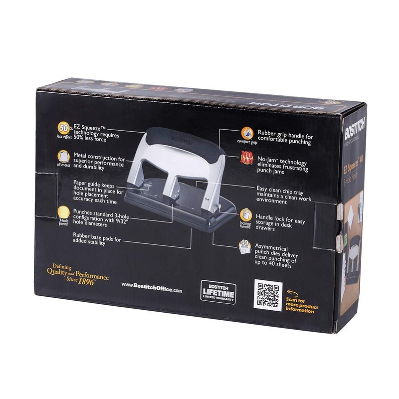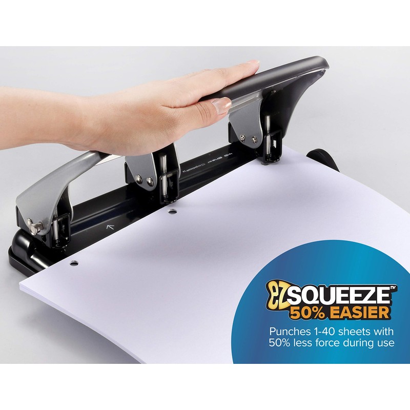Comfortably and easily slice through stacks of paper with 50% less effort using EZ Squeeze technology. With an all-metal design and a wide handle for maximized comfort, confidently three-hole punch up to 40 sheets of paper with 50% less force than comparable punches. Ensure professional, consistent 3-hole placement using the built-in paper guide. The easy-to-clean chip tray maintains a tidy environment while the rubber base of the paper punch provides extra stability and protects your desktop during heavy use. With a versatile range of 1 sheet to 40 sheets, this punch works for light duty to heavy duty use. Great for work, school, or the home office. Standard three hole configuration with 9/32” diameter holes.
