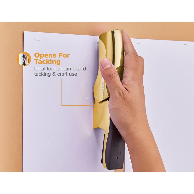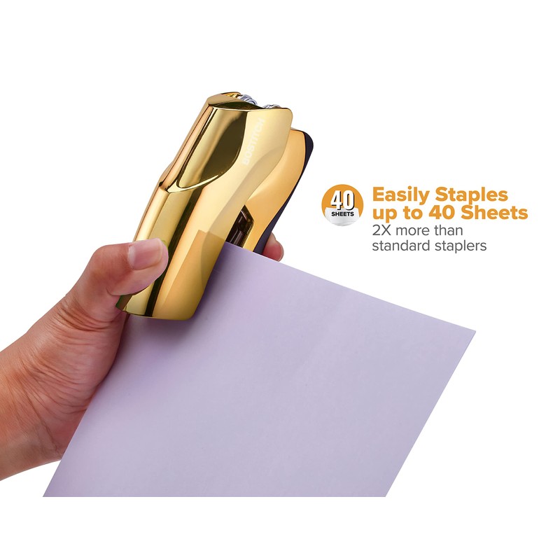 This metallic gold flat clinch stapler features a half strip design while retaining all the stapling power of a heavy duty, full sized stapler. This stylish and trendy stapler can also staple up to 40 sheets of paper at once! Most standard handheld staplers can only handle 20 sheets at a time. This unit also features a convenient flat clinch stapling style. Flat clinch staplers allow documents to lay in flatter, neater stacks. You can keep your papers organized and your desktop clean with the help of this compact stapler. Perfect for any desk in your home office or business, this lavish gold stapler will be one of the best-looking office supplies around! Additionally, this beautiful stapler opens a full 180 degrees for bulletin board use and features a non-skid, rubber base. Just add your Bostitch standard staples and you're ready to tackle all the stapling and filing projects ahead.