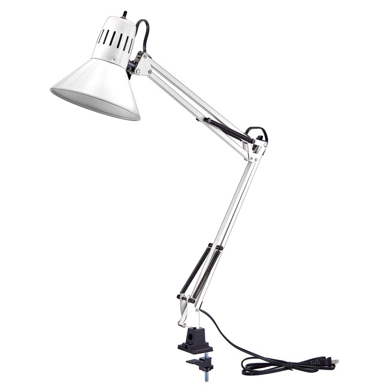 While this Bostitch adjustable swing arm desk white lamp may not have an ordinary base, it features a fully functional and versatile clip on base! It has a clamp at the bottom to easily mount or attach it to your desk, workbench or table's edge. The long, multi-joint arm allows this clamp on desk lamp to reach 36 inches high and adjusts to achieve any position. Whether you're looking for the perfect lamp for your home office, reading or study time or even for crafts, no surface goes unlit as this lamp easily clears monitors and large surface tops. Each clamp lamp has an all metal construction to provide durability and longevity. It even comes ready to use as it includes a replaceable LED light bulb for brilliant lighting in any room with the quick plug in at any electric outlet. This lamp takes on a minimalist, classic look, making it easy to incorporate it into any office, dorm or classroom.
