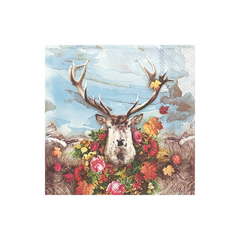 - Design features a buck's head surrounded by colourful foliage against a sky blue background
