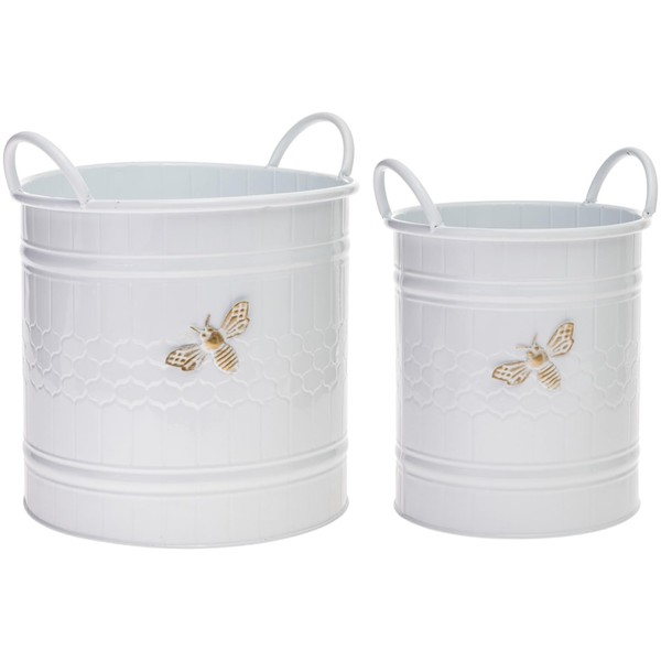 Boston International White Round Metal Planter Buckets with Handles, Set of 2, Bee