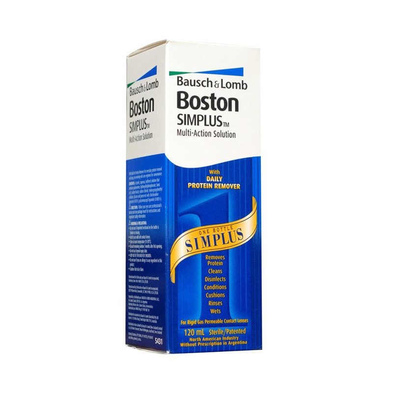 Boston Simplus Multi-Action Solution 120ml is a one-bottle lens care system that not only cleans, disinfects and conditions gas permeable contact lenses, but also removes protein daily. Boston Simplus Solution requires no evening rub care regimen - just rub and rinse prior to lens wear. Performance and convenience for today's active gas permeable contact lens wearer.