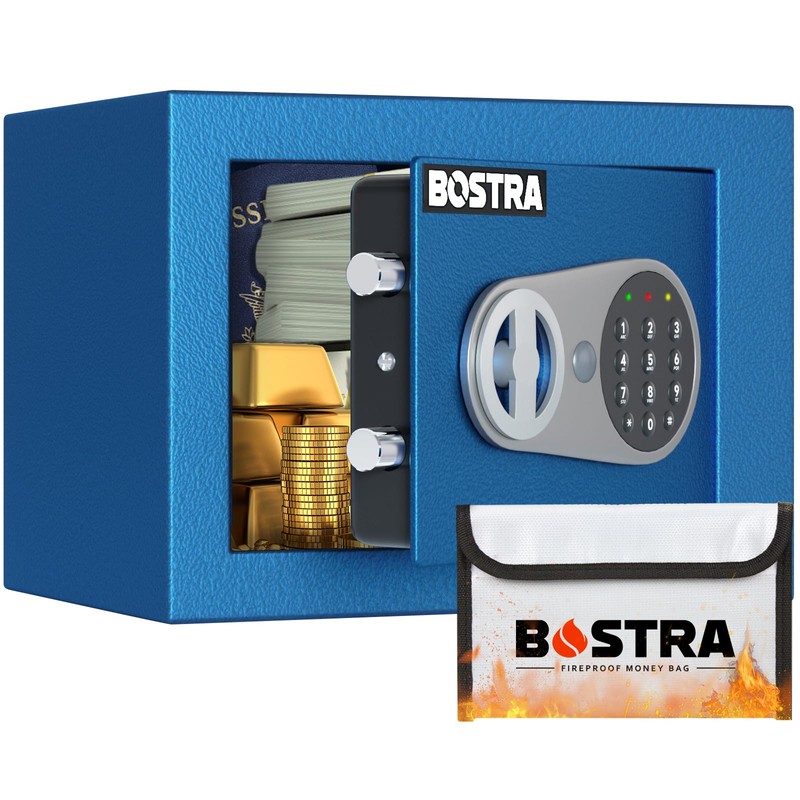 Bostra Fireproof Safe Box with Sensor Light & Fireproof Bag, Money Safe Box with Digital Keypad,Security Safe Box for Home, 0.23 Cubic Small Safe with Keys & Pass Code for Cash Jewelry Blue