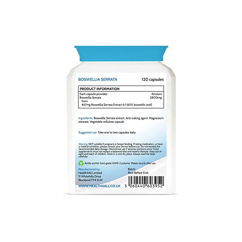 - Our Health4All Boswellia Serrata capsule provides 2800mg of Boswellia (from 6:1 extract standardised to 65% boswellic acids).