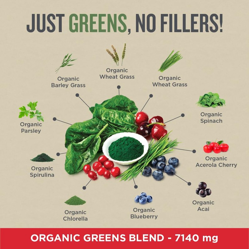 - Highly Concentrated Organic Greens: Each serving contains 7140 mg of a powerful blend of organic chlorella, spirulina, and leafy greens to help you meet your daily greens intake and supplement your body with superfoods.