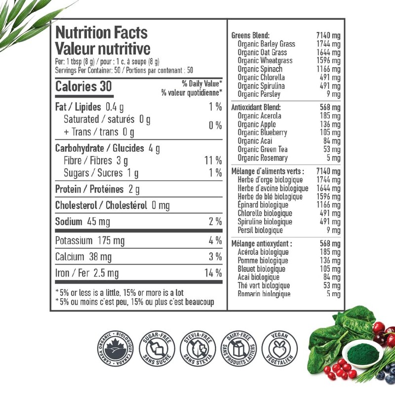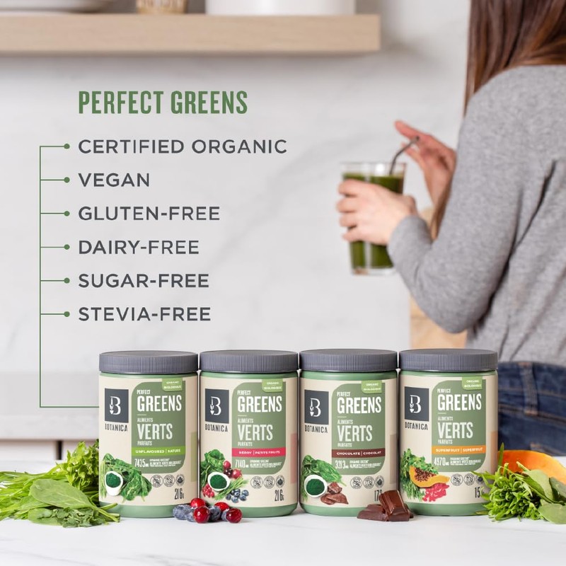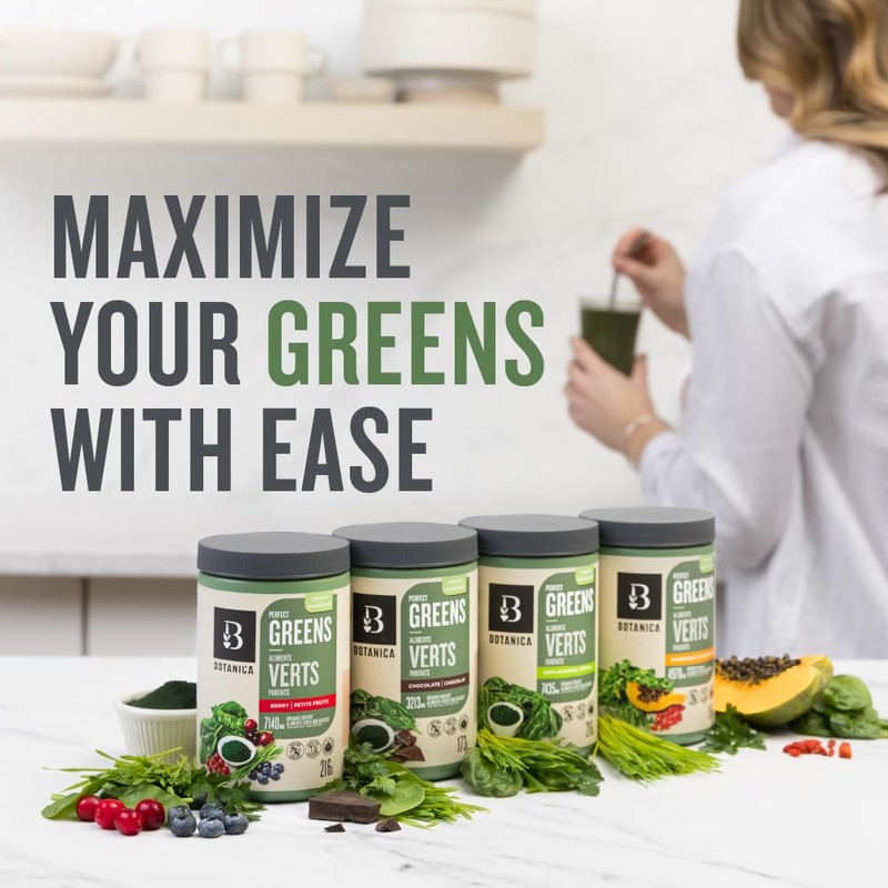 - Easy to Use and Versatile: Stir one tablespoon (8g) of Botanica Perfect Greens into a cup (250mL) of water, juice, or your favorite smoothie.
