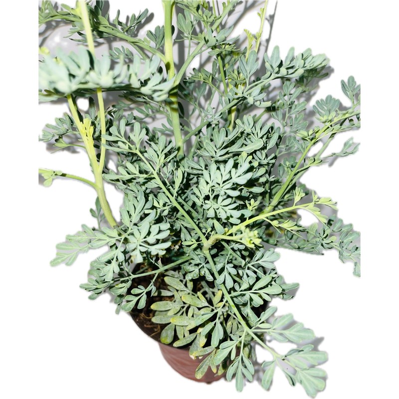Planta de Ruda viva de 8 a 10 pulgadas de altura, sembrada en un pote con tierra. / Live Rue plant 8" to 10" height potted in 4" plastic pot with soil.
