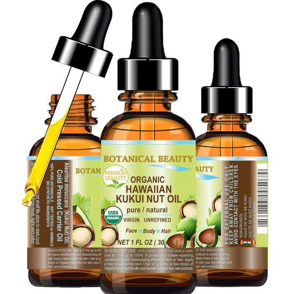 Botanical Beauty Certified Organic KUKUI NUT OIL 100% Pure Natural Virgin Unrefined Cold-Pressed Carrier Oil for Face, Skin, Body, Hair, Lip, Nails. Rich in Vitamin E (1 Fl Oz)