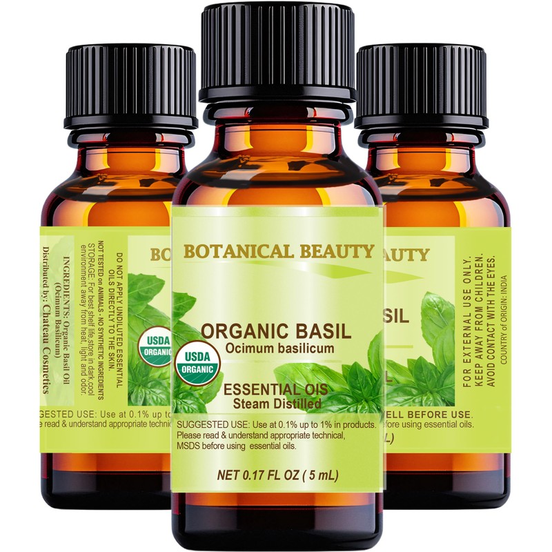 Botanical Beauty Organic Basil Essential Oil. 100% Pure for Beauty, Skin, Hair, Aromatherapy, Soaps, Candles, Reed 0.17 Fl Oz - 5 ml