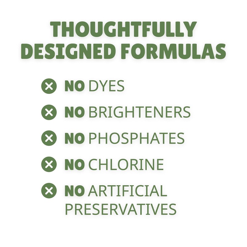 - FREE FROM DYES AND BRIGHTENERS: Get a deep clean without the use of dyes, brighteners, chlorine, phosphate and artificial preservatives. We do the dirty work in a cleaner way.