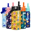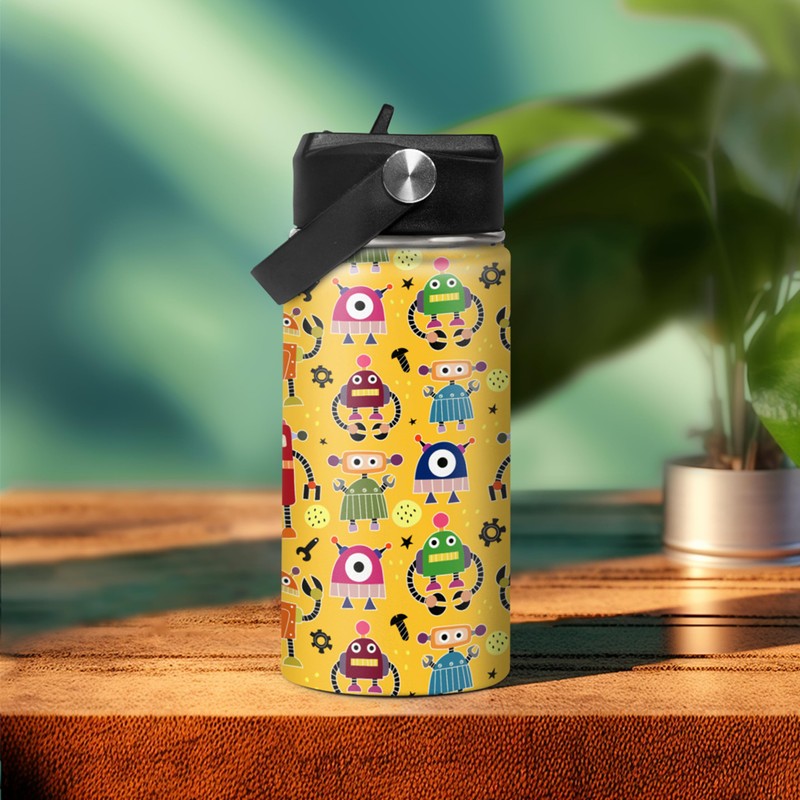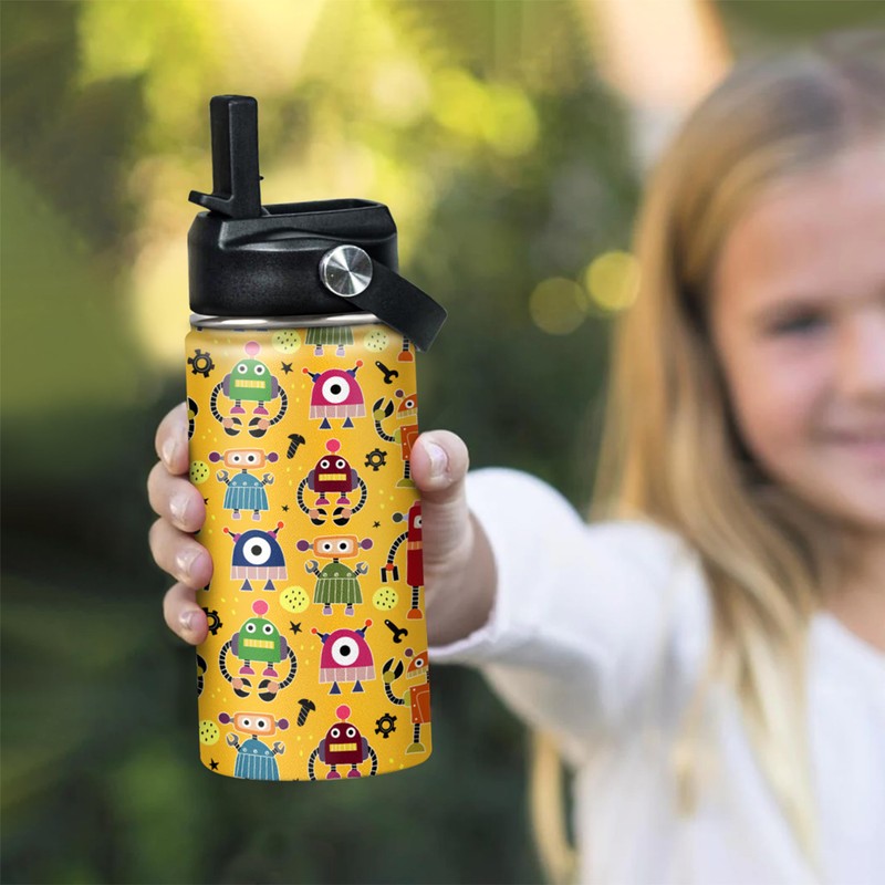 Botella de agua para niños con pajita con robot aislado, botellas de agua de acero inoxidable de 12 onzas, vaso de doble pared al aspiradora para niños