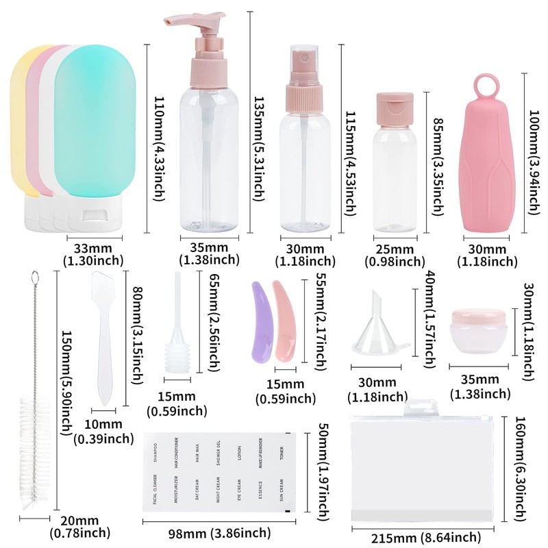 - [Juego de botellas de viaje reutilizables] Nuestro juego de contenedores de viaje incluye 4 * botellas exprimibles, 1 * botella con bomba, 1 * botella con atomizador, 1 * botella con tapa abatible, 3 * frascos, 3 * cucharas, 1 * embudo, 1 * gotero, 1 * funda elástica a prueba de fugas, 1 * bolsa de PVC, 1 * cepillo limpio y 1 * etiqueta de página. Diferentes accesorios para sus diferentes necesidades