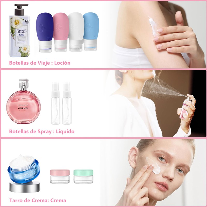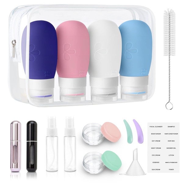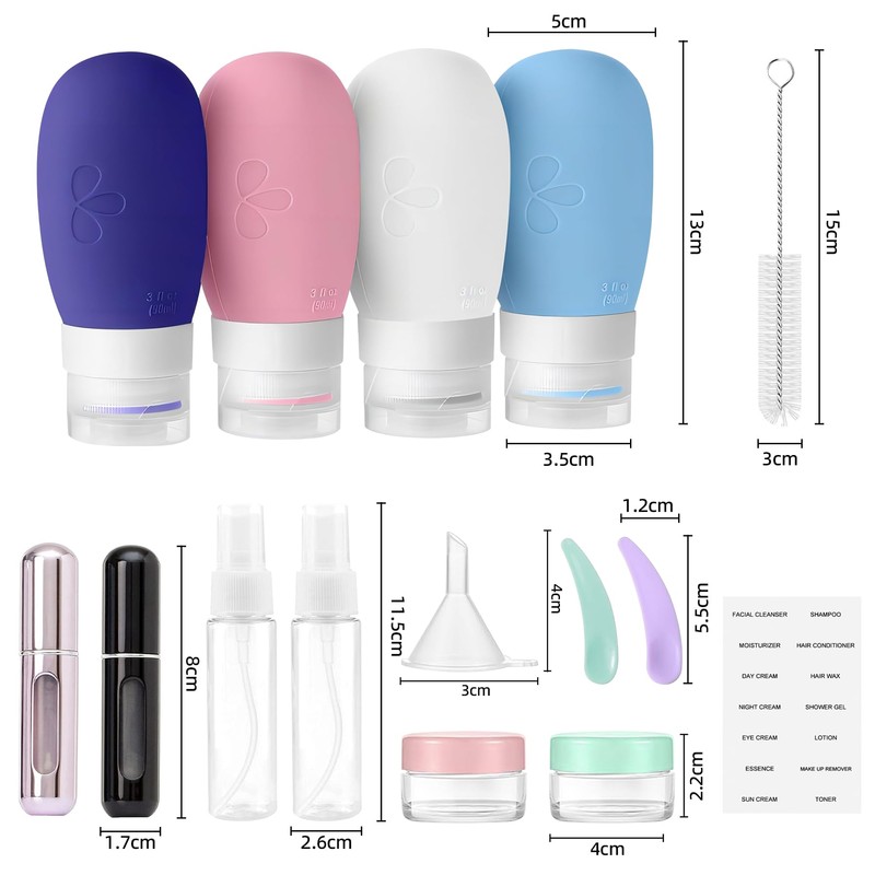 - 🏜️ 【Juego de 16 Botellas】 juego de 16 contenedores de viaje a prueba de fugas, recibirás:2 botellas de silicona de 2 onzas, 2 botellas de spray, 2 botellas de silicona de 3 onzas, 1 bolsa de almacenamiento, 2 cuchara, 1 cepillo de limpieza, 1 embudo, 2 botella de pulverización, 2 tarros de crema, 1 etiqueta de página,perfecto para tu viaje o viaje de negocios.
