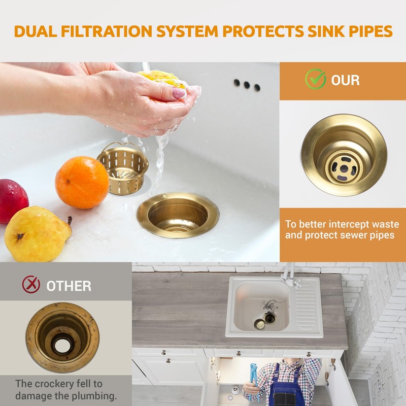 - DURABLE STAINLESS STEEL: The gold kitchen sink drain is made of premium 304 stainless steel for durability and resistant to rust and corrosion to provide reliable filtration for years to come (NOTE: It can not be connected to the garbage disposal.)