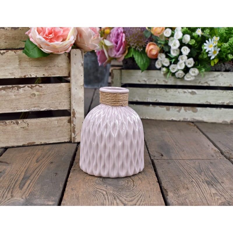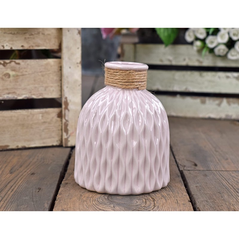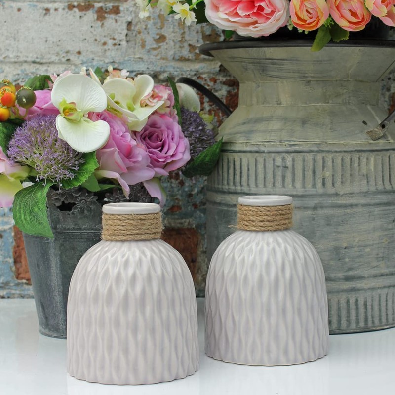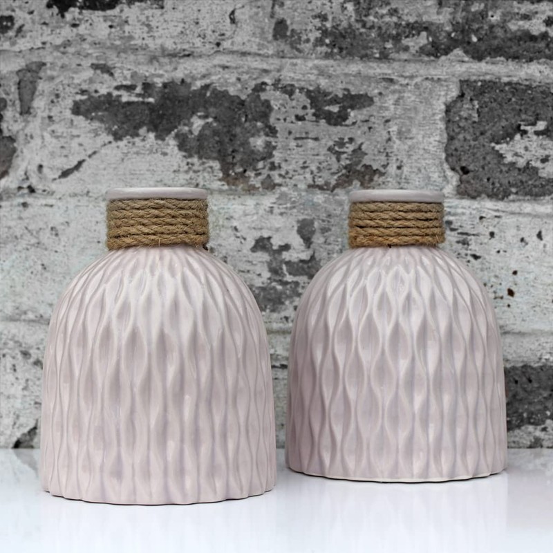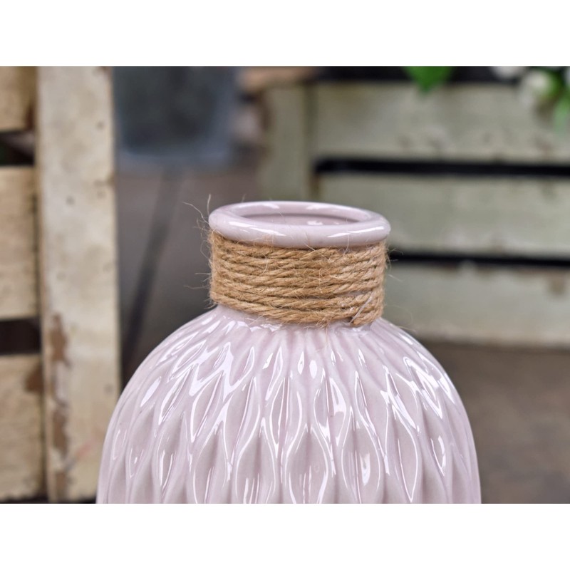 - This stunningly graceful Nordic inspired vase brings a touch of rustic elegance to the home with its unique natural hemp rope detailing. The decorative geometric wavy stripe adds elegance and interest to the piece which will subtly blend seamlessly with any décor.