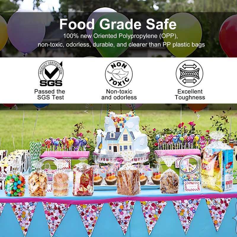 - 【Food Grade Safe】 100% new Oriented Polypropylene (OPP), non-toxic, odorless, durable, and clearer than PP plastic bags, their excellent vapor-blocking properties keep food and treats fresh, protect the contents from dust, bugs, fingerprints, moisture, and mildew, extending their shelf life.