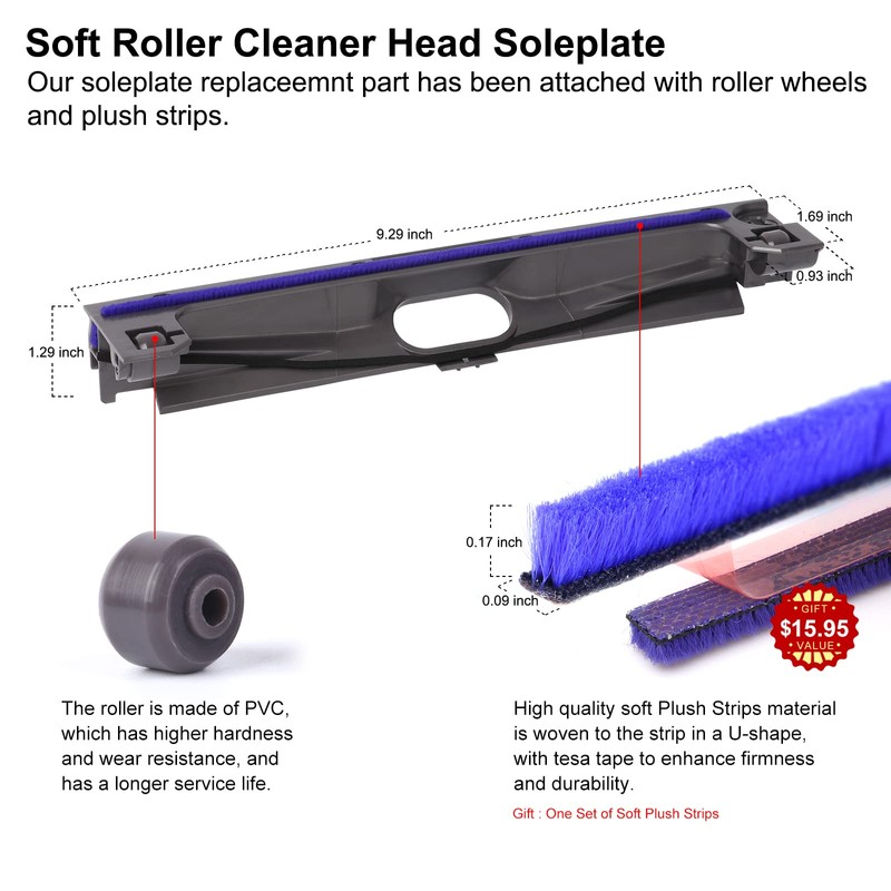 *The bottom soleplate material is wear-resistant,just need to replace this part,avoid wasting money by repeatedly changing wheels and soft plush strips. *Accurate size and perfect match with the original V6 V7 V8 V10 V11 soft roller cleaner head soleplate kit.